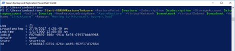 All necessary information collected and stored in variables, we can proceed with restoring our VM from backup. As mention before we will use command Start-VBRVMRestoreToAzure with parameters -RestorePoint -Subscription -StorageAccount -VMSize -NewResourcesGroup -VirtualNetwork -VirtualSubnet -VMName -Reason. Pressing Enter will start the job and display information about it. We can see that the “Results” is in Starting state.