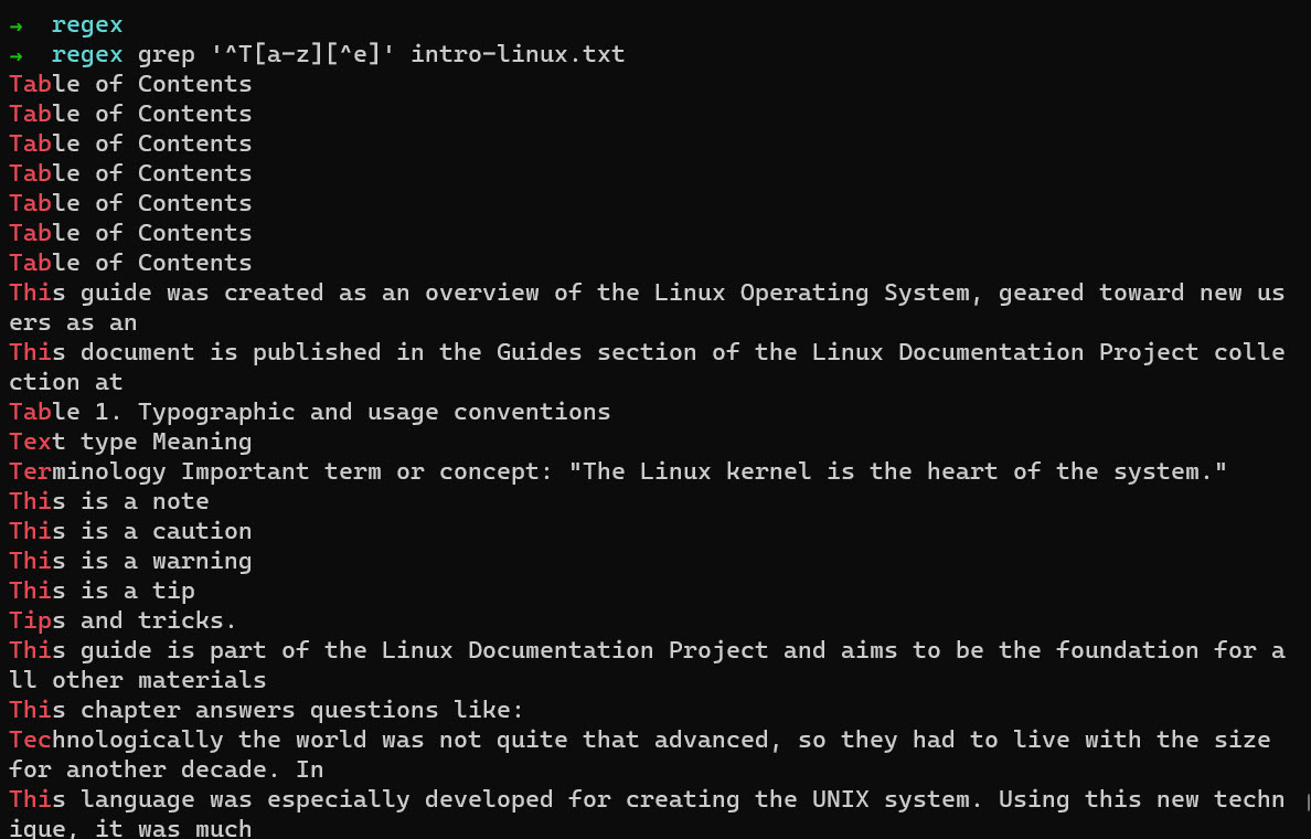 Let us try something different. We want to find any line which starts with “T” but does not end with “e” The command will look like this: grep ‘^T[a-z][^e]’ intro-linux.txt. Here we can see we are using the begin symbol follow by uppercase “T” followed by any character from a-z, and next, we put the begin symbol which here will mean is not and letter “e”. And we can see that we get many different lines starting with “T” but not the “The”