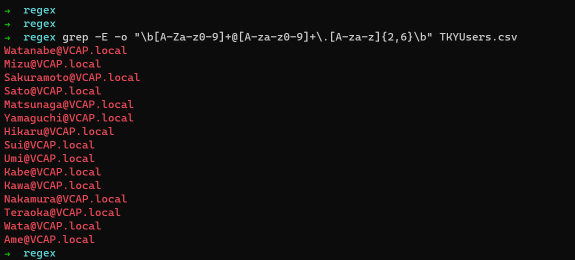 But what if we like to find something more specific like let’s say email address, we can use a regular expression to do just that. We start with the grep follow by -E which means extended regular expressions, next -o to show only lines which match. Next, we put “\b[A-Za-z0-9] which means we want to find any word containing uppercase letters A-Z or lowercase letters a-z and numbers 0-9, that following by plus sing and @ and again any letters or number +@[A-Za-z0-9]. Next, we put an escape symbol \ follow by a dot and again follow by any uppercase or lowercase letters A-Z and numbers 0-9 we add {2,6} which means that there should be 2 to 6 letters at the end of our email. Full command will looks like : grep -E -o “\b[A-Za-z0-9]+@[A-za-z0-9]+.[A-za-z]{2,5}\b” TKYUsers.csv and we can see that we get all email addresses from the file.