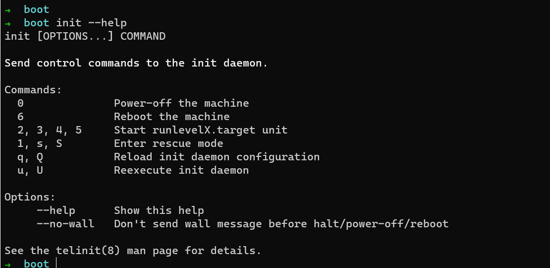 Init send control commands to the init daemons, and it can be used as well to perform shutdown and reboot of the Linux server. We have to specify numbers 0 and 6, respectively.