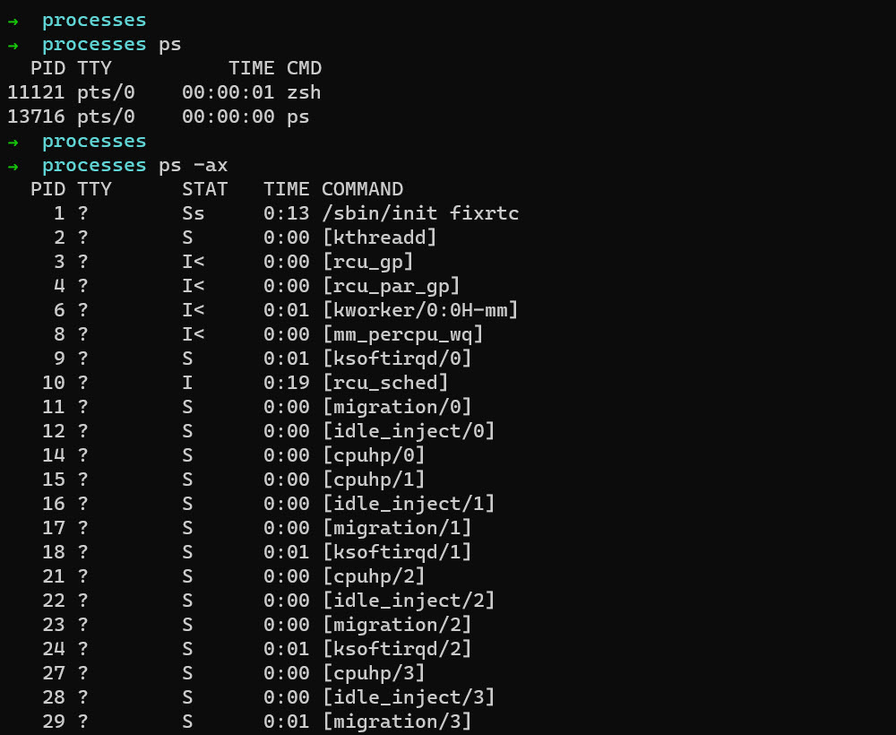 The ps command – display a snapshot of processes at a specific time, useful to capture running processes, check ownership, and PID of the process. Running the command without any operators, we will get processes running in the current shell, PID – unique ID, TTY – a type of terminal user is logged on, TIME – the time the process has been running, CMD – the command that launched the process. Adding –ax will display all processes running and as well not associate with our terminal.
