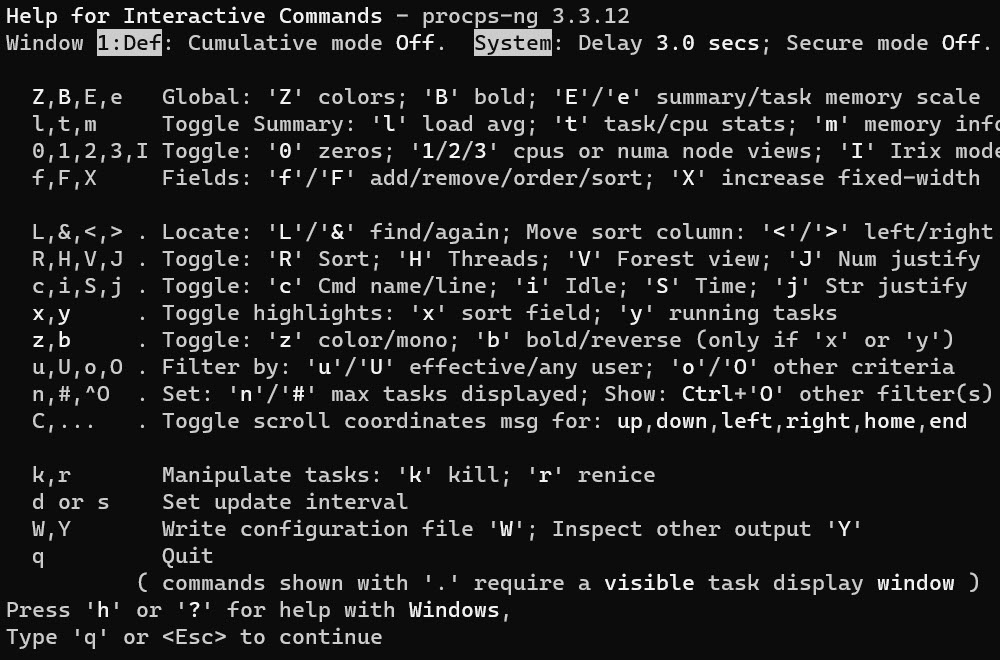 We can access the interactive help for the top by pressing the h key, we will see all the options we can change to view a different kinds of information about our running system.