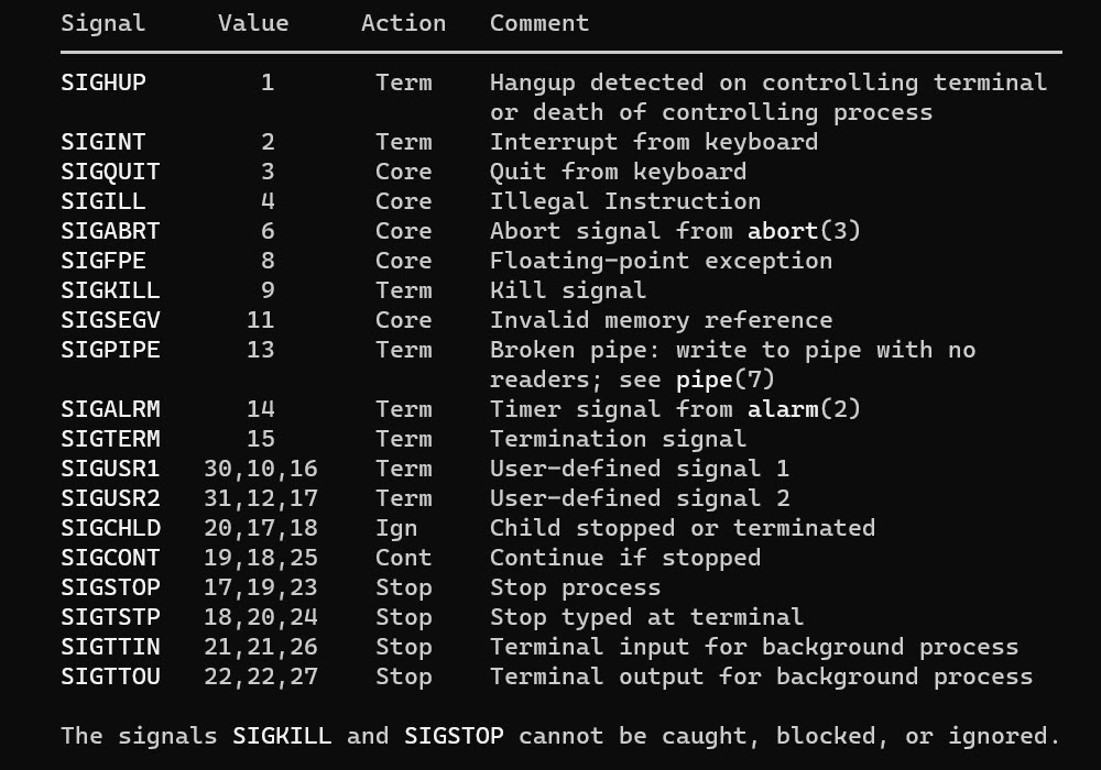 One additional function of htop is the possibility to kill processes, we can simply select the process and press k or F9 to be redirected to a new menu where we have many options to send a command to the process, select number 9, and press Enter to proceed. To learn more about the signal options we can run man 7 signal scroll down to line 140. We will be present with all the signal option and explanation (screenshot below)